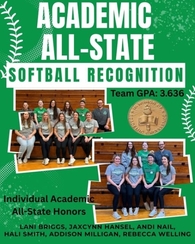 Congratulations to the Varsity Softball Team for being recognized as a team for Academic All-State Softball. Teams must have an average GPA of 3.3 or higher to receive this honor. Special shout-out to the following ladies for maintaining a 3.7 or higher GPA and receiving individual honors: Lani Briggs, Jaxcynn Hansel, Andi Nail, Hali Smith, Addison Milligan, and Rebecca Welling.